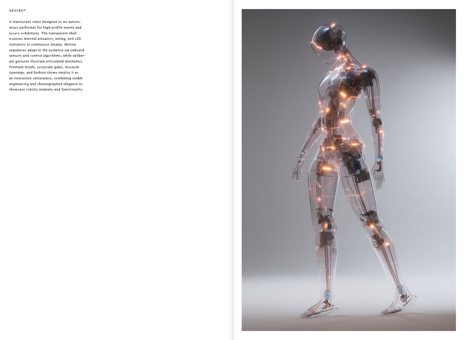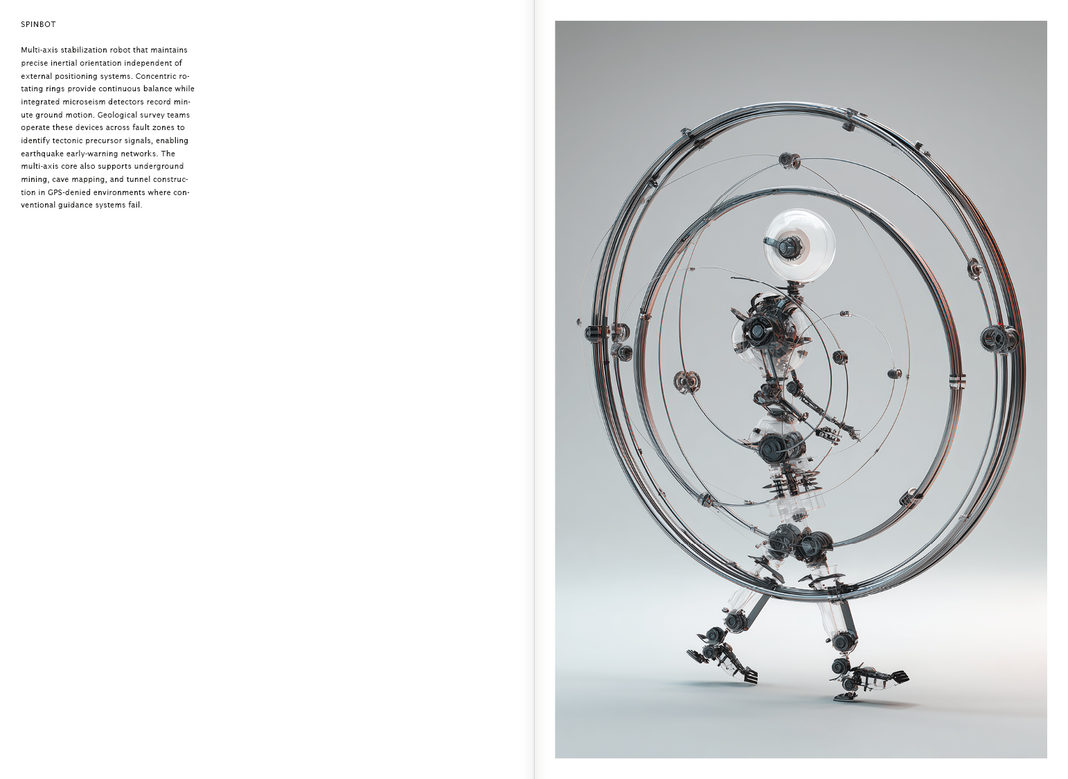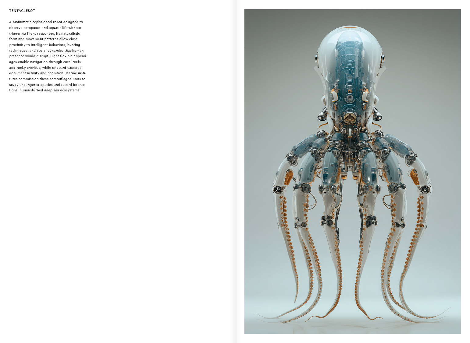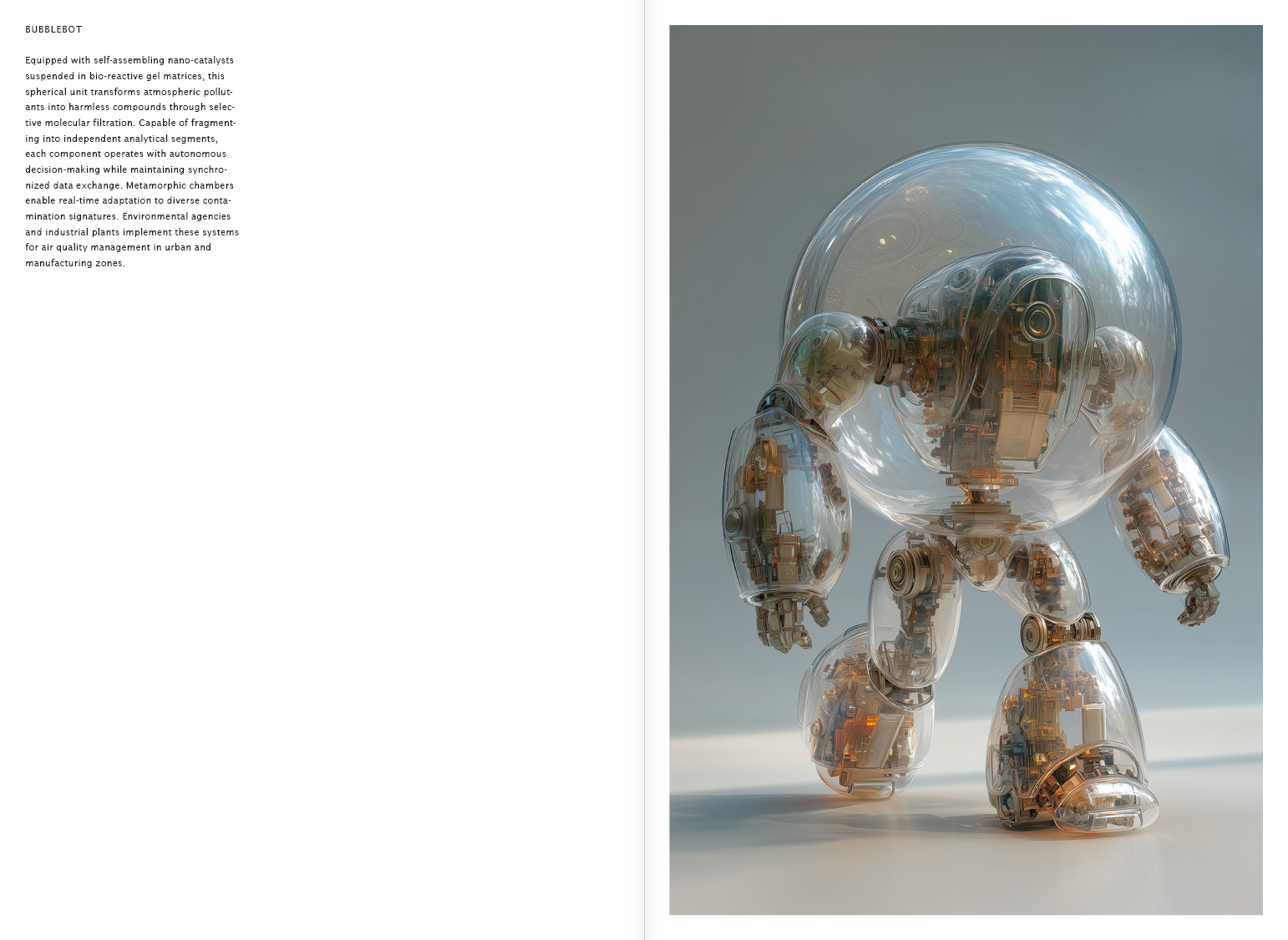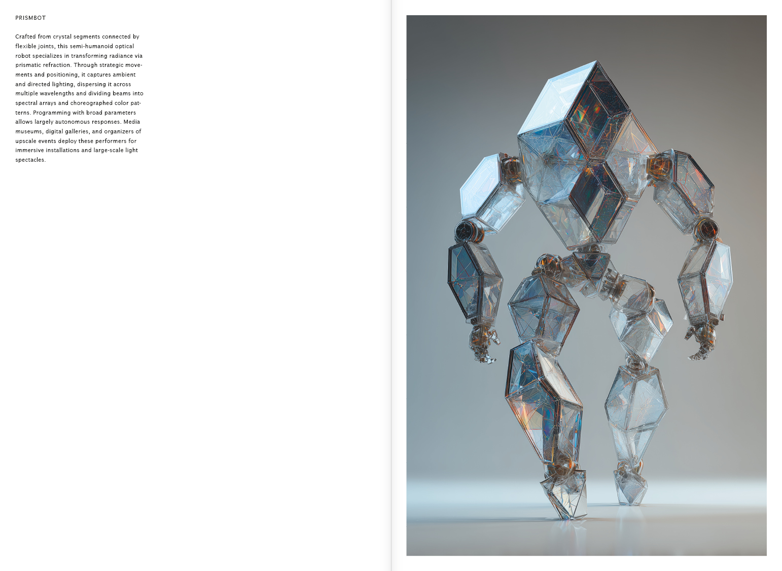 Robots are the bodies of artificial intelligence. They learn by interacting with the real world, perfecting themselves through experience. One day they will reproduce themselves – and maybe even surpass us. This book presents 55 fictional robot types generated by AI: humanoid and non-humanoid beings, each with a concise description of their capabilities. A compendium of imagined techno-entities – plausible and fantastical, instrumental and romantic, ironic and dystopian. How this future will unfold, we can just surmise. Only one thing is certain: The future is robotic. – Andreas Müller-Pohle: Robots. A Speculative Compendium. With an essay by the artist. Berlin: Equivalence, 2025. Hardcover, 21 x 30 cm, 128 pages, 55 illustrations, ISBN 978-3-923283-74-3, EUR 44.00, German/English